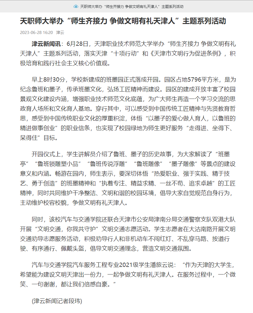 旨系列举动”为题报导乐玩官网举行班朱园启园典礼等系列焦点举动,深刻促进师死争干文化有礼天津人。